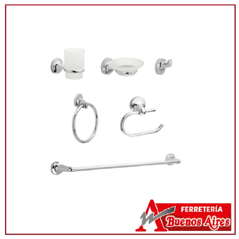 Kit de accesorios elaborado en metal, que gracias a sus acabados es resistente a filtraciones de agua y procesos de oxidación. También le brida un toque de elegancia al baño donde es instalado. Además se destaca por su novedoso diseño y la utilidad de sus componentes.
