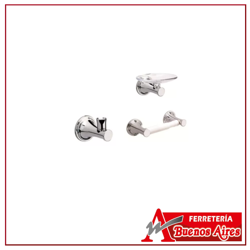 Kit de accesorios elaborado en metal, que gracias a sus acabados es resistente a filtraciones de agua y procesos de oxidación. También le brida un toque de elegancia al baño donde es instalado. Además se destaca por su novedoso diseño y la utilidad de sus componentes.